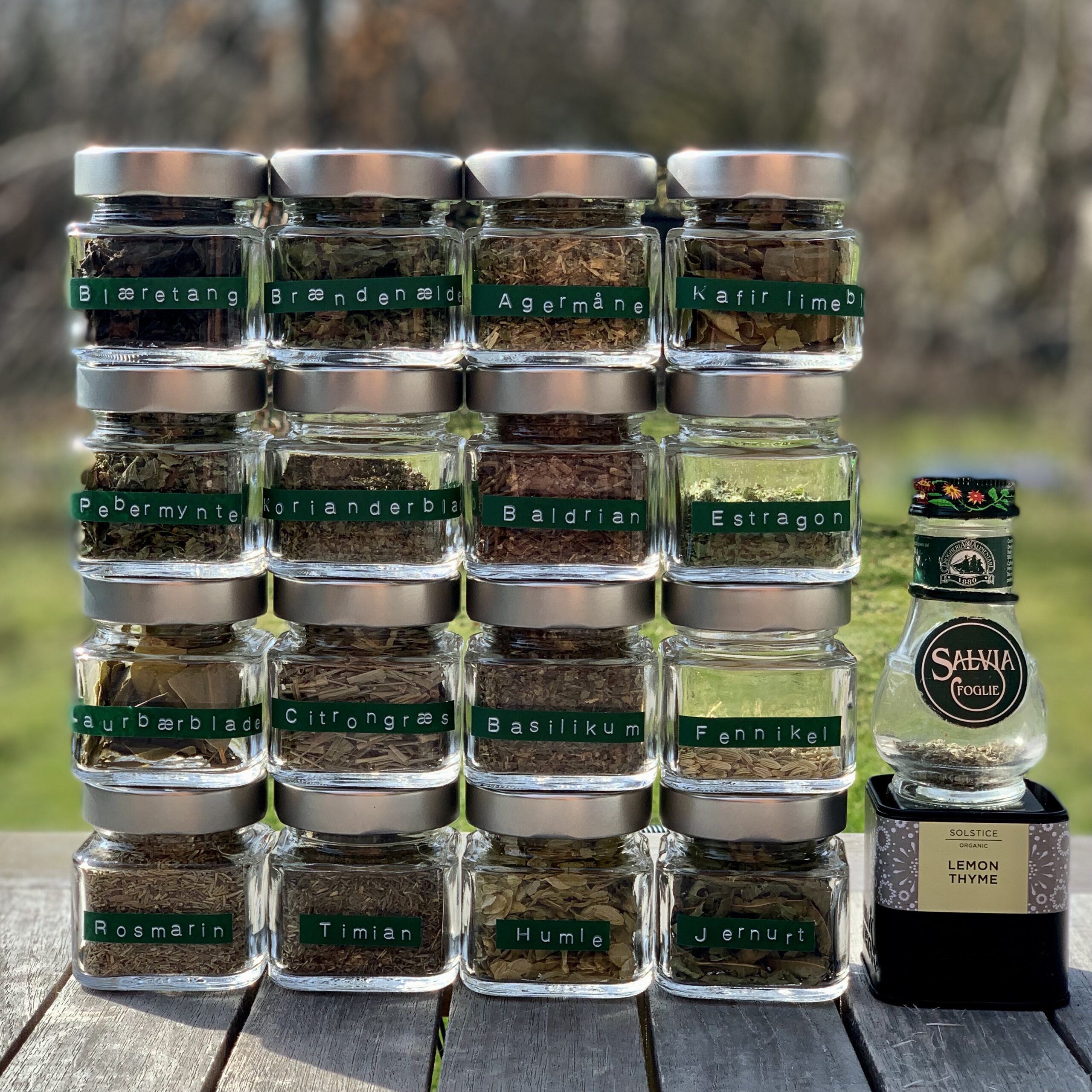 Urterne: Rosmarin, salvie, citronmelisse, mynte, perbermynte, timian, citrontiman, humle, laurbærblade, estragon, jernurt (citronverbena), fennikel, blæretang, baldrianrod, brændenælde, agermåne, rosmarin.