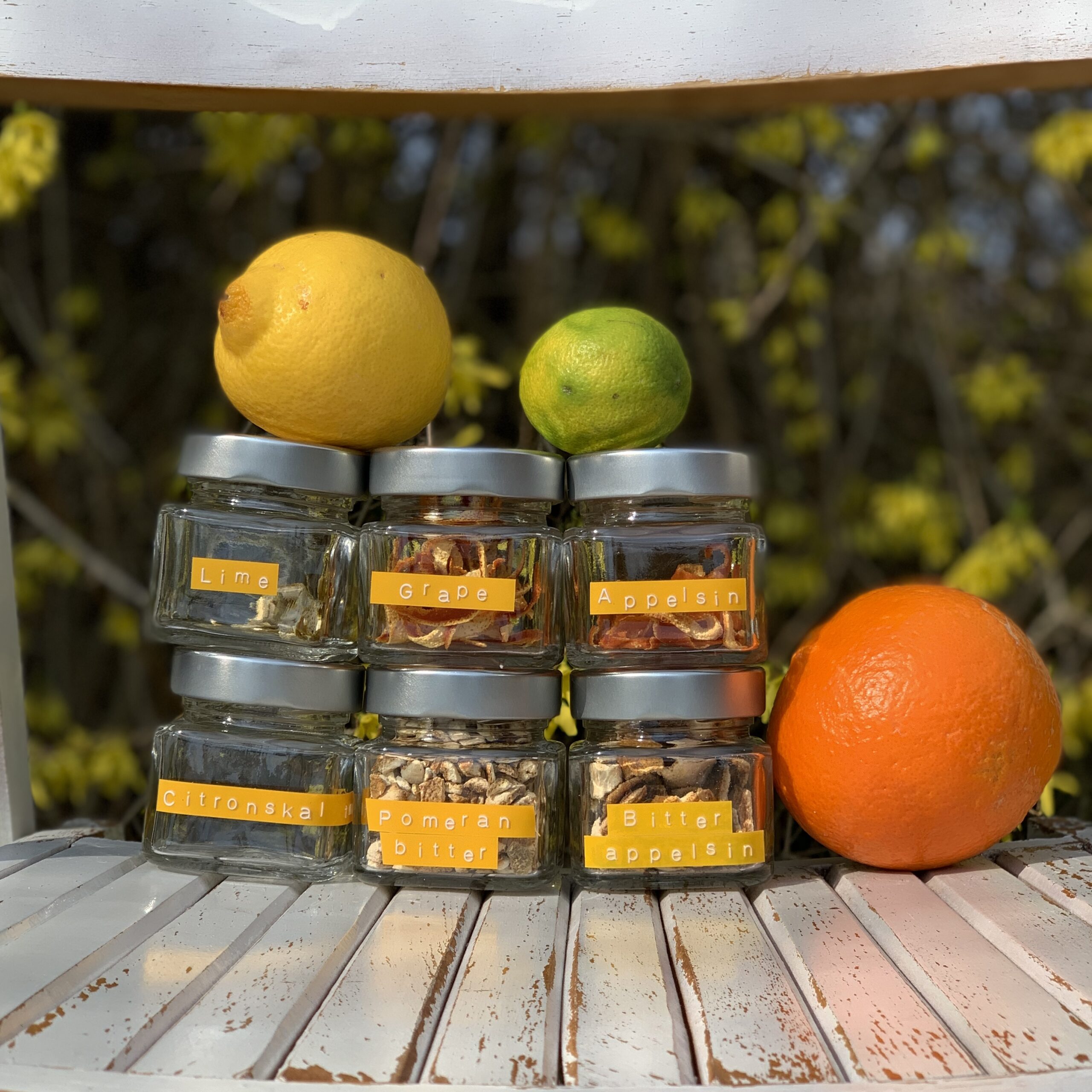 Citrusfrugterne: Frisk og tørret skal af citron, appelsin, lime, grapefrugt, pomeran.