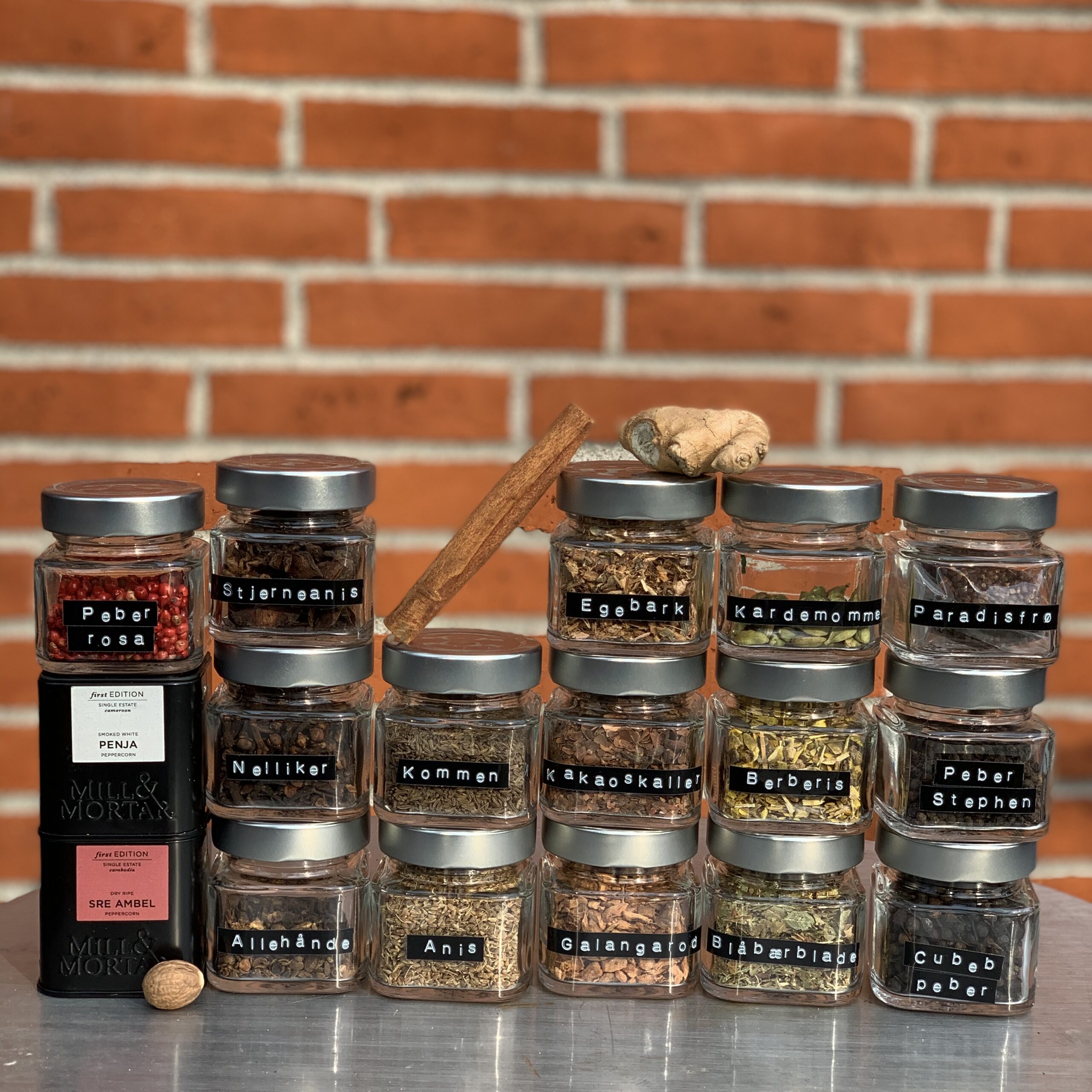 Krydderierne: Kanel, kardemomme, muskatnød, ingefær, sorte og rosa peberkorn, cubeb peberkorn, kommen, anis, galanga, blåbærblade, egebark, berberisbark, duftgeranium, cassiabark.