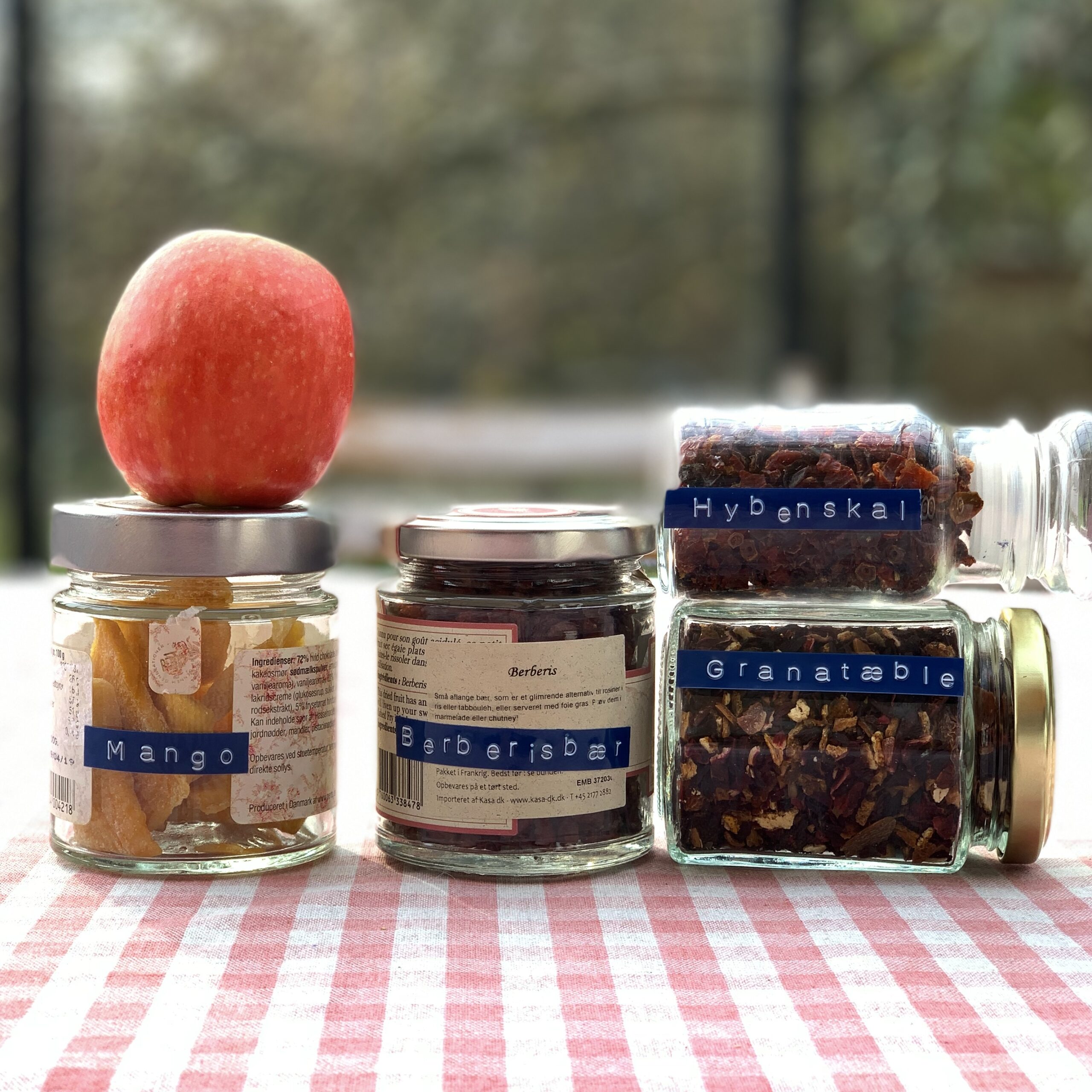 Frugterne: Morbær, brombær, hindbær, æble, solbær, mango, hyben, rabarber, berberisbær, granatæble.
