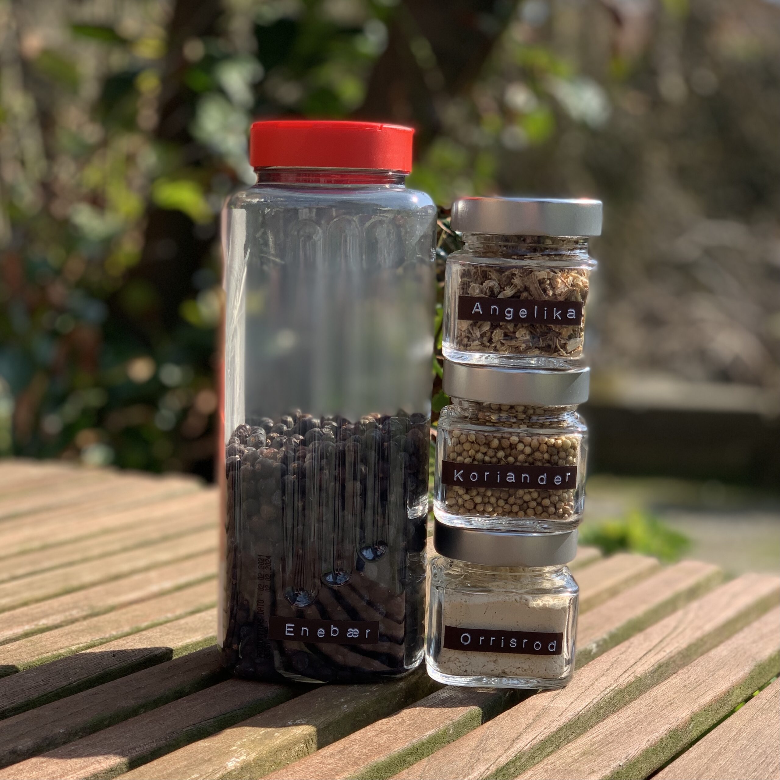 De essentielle: Enebær, koriander og angelikarod (kvanrod) eller orrisrod.