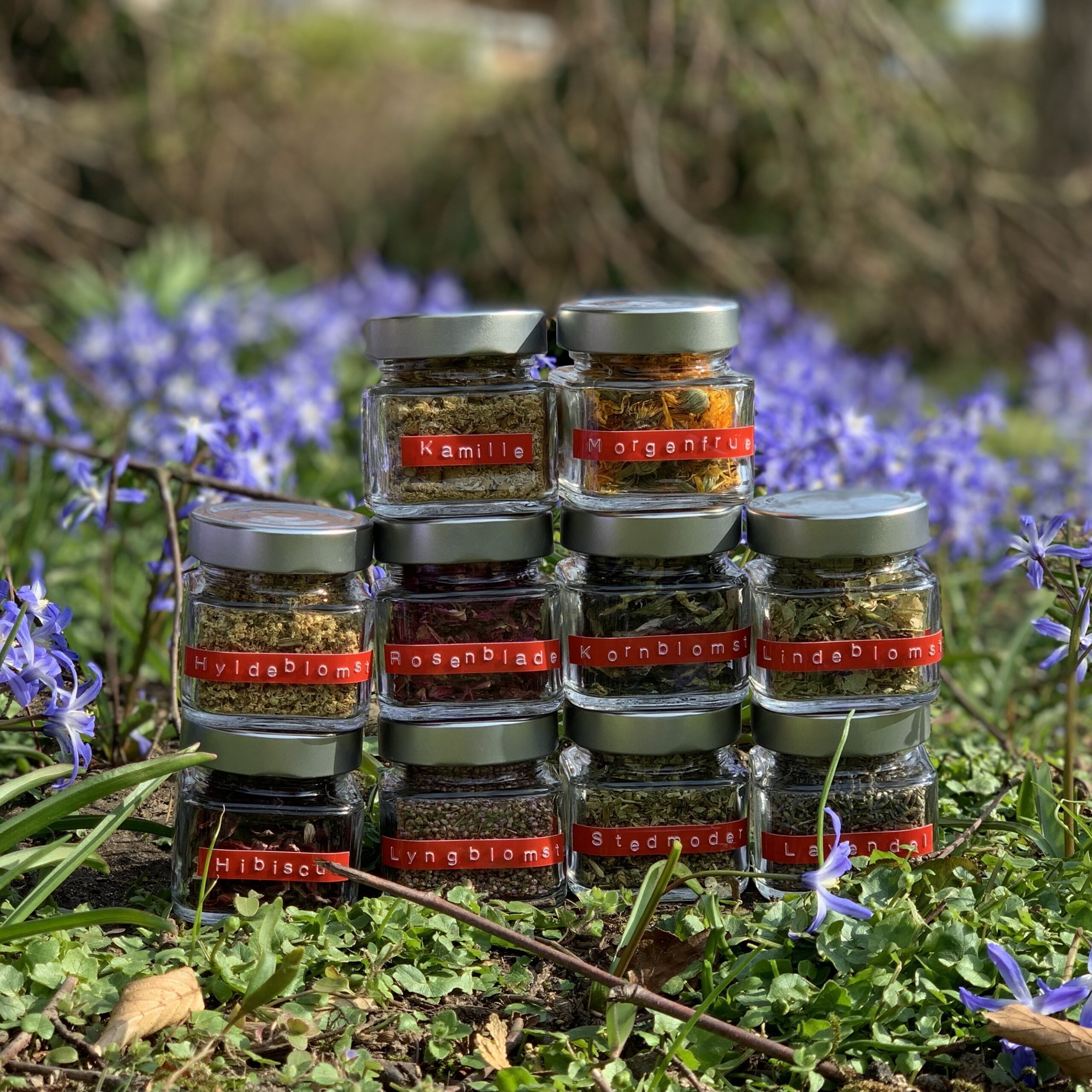 Blomsterne: Rosenblade, kamilleblomst, blå lavendelblomst, hyldeblomst, morgengruer, lyngblomster, hibiscus, stedmoderblomst, lindeblomst.